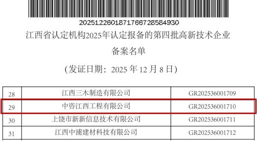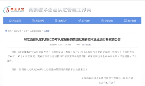 近期,根据全国高新技术企业认定管理工作领导小组办公室发布的《对江西省认定机构2025年认定报备的第四批高新技术企业进行备案的公告》,公司再次获得高新技术企业认定,这是继2019年、2022年之后,第三次被认定为国家高新技术企业。